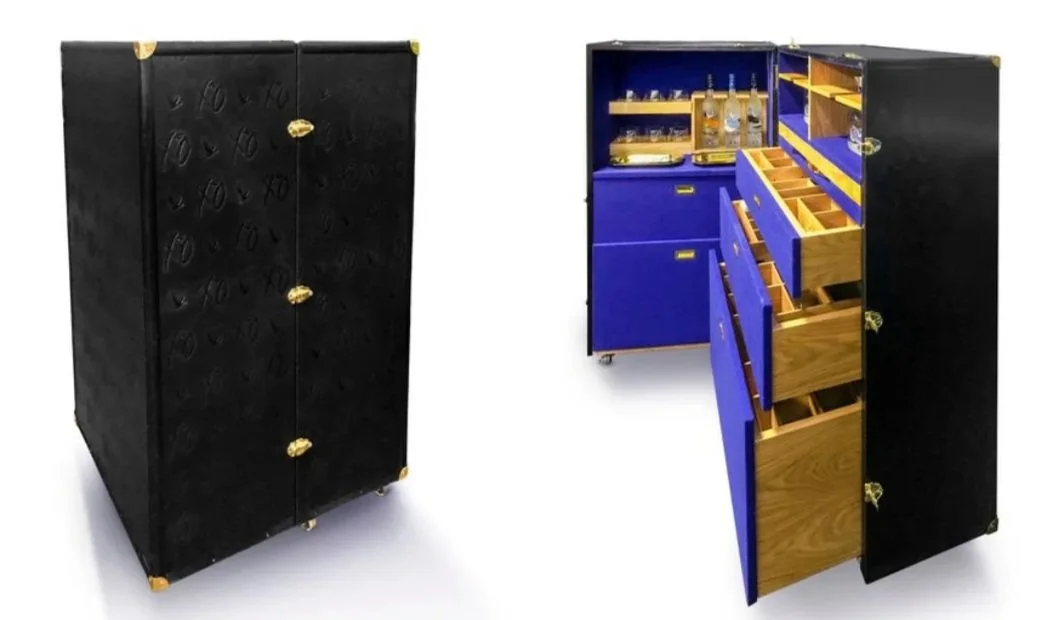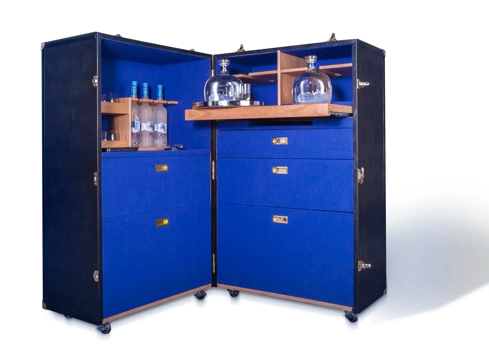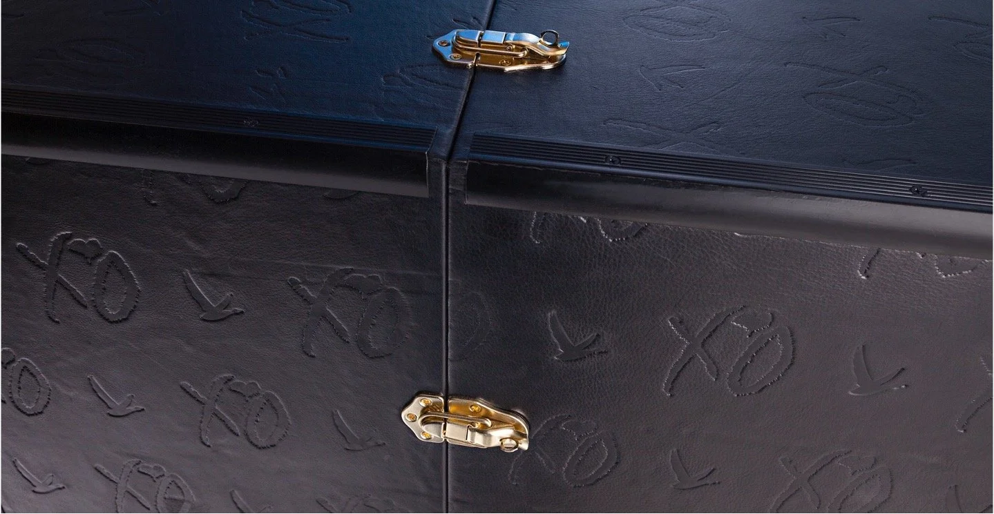 Concepted and designed a custom gift that accompanied The Weeknd on tour. Handcrafted of fine materials including debossed leather and high-end hardware, this bespoke trunk opens to be a GREY GOOSE bar, complete with rich wood shelves and drawers, plus luxurious felt-lined storage nooks.